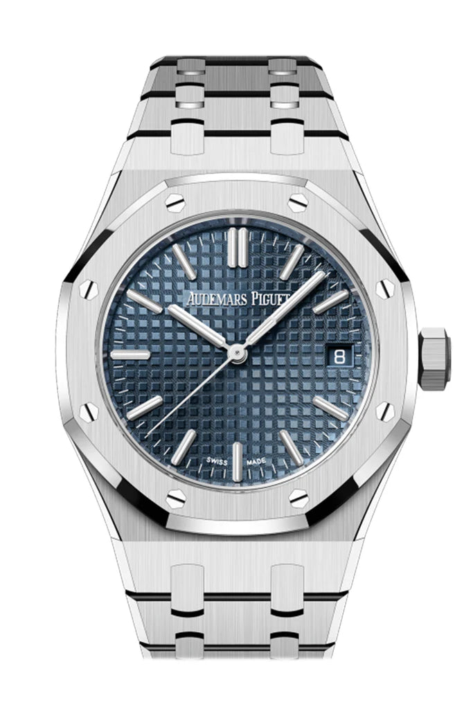 Discover the elegance of the Audemars Piguet Royal Oak 37mm, featuring a captivating Bleu Nuit Nuage 50 dial set within a sleek stainless steel case. This luxury timepiece combines the iconic "Tapisserie" pattern with impeccable craftsmanship, perfect for discerning collectors and watch enthusiasts. With its self-winding movement and timeless design, this Royal Oak model epitomizes sophistication and style.