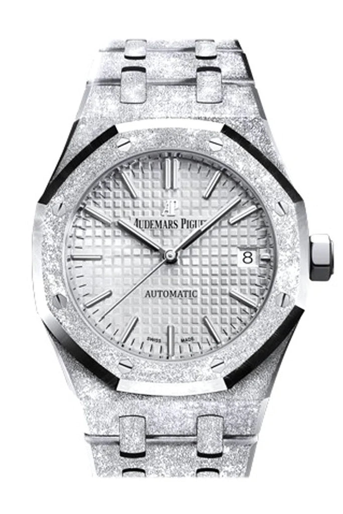 Embrace unparalleled luxury with the Audemars Piguet Royal Oak 37mm women's watch, masterfully crafted from hammered 18K white gold. This stunning timepiece features a rhodium dial adorned with the iconic "Grande Tapisserie" pattern, exuding elegance and sophistication. The frosted gold finish of the case and bracelet adds a unique, shimmering texture, elevating its aesthetic appeal. Powered by an automatic movement, the watch guarantees precise timekeeping with Audemars Piguet's esteemed craftsmanship. Enhance your collection with the Audemars Piguet Royal Oak 37mm, a true symbol of refined style and artisanal excellence.