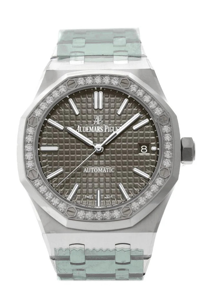 Discover timeless elegance with the Audemars Piguet Royal Oak 37mm women's watch. Meticulously crafted from stainless steel, this exquisite timepiece features a sophisticated grey ruthenium-toned dial adorned with sparkling diamonds and the iconic "Grande Tapisserie" pattern. The diamond-set bezel adds a touch of luxury, while the integrated stainless steel bracelet ensures both comfort and style. Powered by an automatic movement, the watch guarantees precise timekeeping with Audemars Piguet's esteemed craftsmanship. Elevate your collection with the Audemars Piguet Royal Oak 37mm, a symbol of refined sophistication and enduring design.