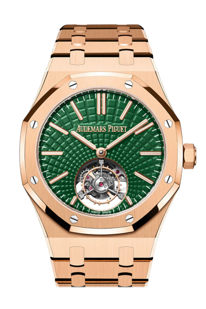 Introducing the Audemars Piguet Royal Oak 41 Flying Tourbillon Rose Gold Green Dial (26533OR.OO.1220OR.01). This exceptional timepiece features a captivating green dial and is crafted from luxurious rose gold. With a flying tourbillon complication, it showcases precision engineering and timeless elegance. Perfect for collectors who value both innovation and meticulous craftsmanship.