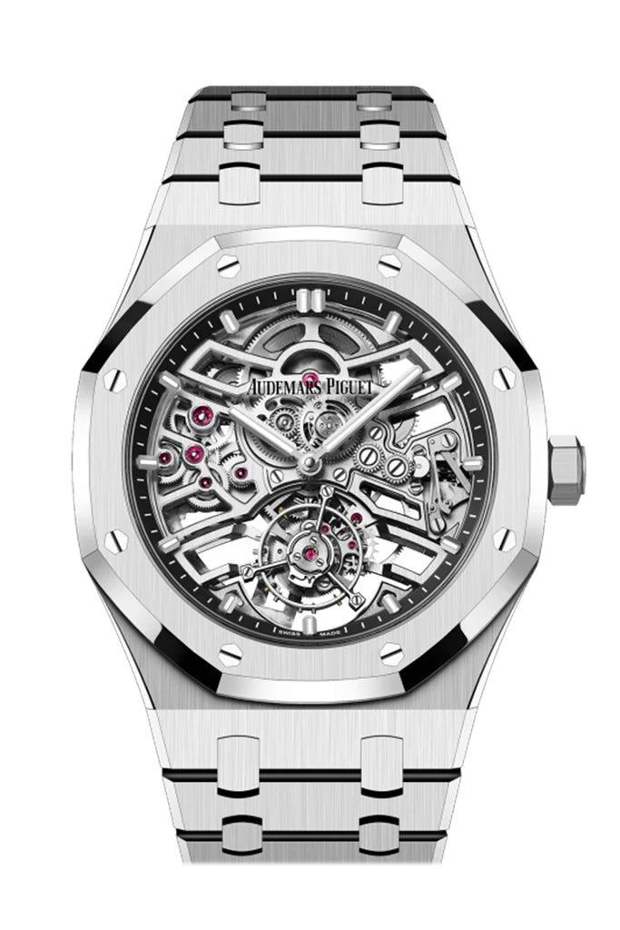 Discover the epitome of contemporary horology with the Audemars Piguet Royal Oak 41 Rhodium-Toned Openworked Dial Stainless Steel Watch. This timepiece showcases a mesmerizing openworked dial in sophisticated rhodium tones, revealing the intricate mechanics beneath. Encased in robust stainless steel and featuring the iconic octagonal bezel and integrated bracelet, it exudes modern elegance and durability. Powered by a precise automatic movement, it guarantees exceptional timekeeping. Embrace innovation and style with this statement piece, perfect for watch enthusiasts seeking a blend of technical mastery and refined design.