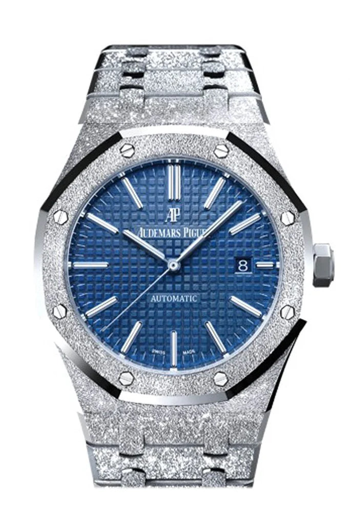 Elevate your collection with the Audemars Piguet Royal Oak 41mm Blue Dial Hammered 18K White Gold Men's Watch. This extraordinary timepiece showcases a captivating blue dial, meticulously housed in a hammered 18K white gold case and bracelet, reflecting the brand's innovative approach to luxury watchmaking. The intricate hammered finish adds a unique texture and brilliance, making it an eye-catching accessory for any occasion. Driven by a precise automatic movement, it promises impeccable timekeeping. Perfect for the sophisticated gentleman, this Royal Oak watch embodies a seamless blend of elegance and craftsmanship, making it a true symbol of prestige.