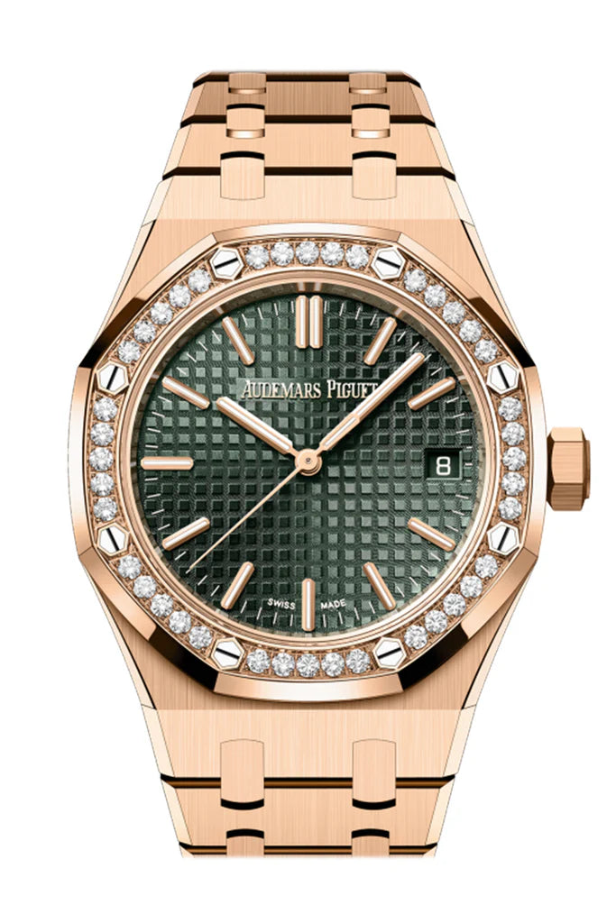 Introducing the Audemars Piguet Royal Oak Khaki Green Dial Rose Gold Diamond Bezel Watch (15551OR.ZZ.1356OR.06), a captivating timepiece that exudes luxury and sophistication.