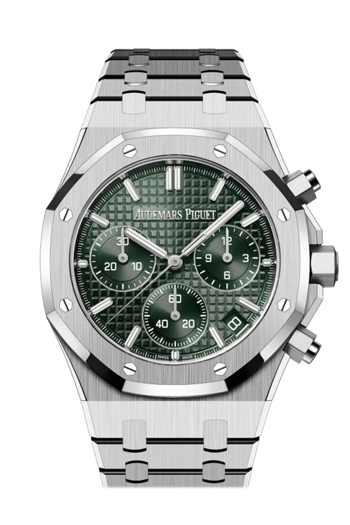 Exude Timeless Glamour: Audemars Piguet Royal Oak Khaki Green Stainless Steel Watch (26240ST.ZZ.1320OR.08). Crafted with exquisite attention to detail, this luxurious timepiece boasts a captivating pink gold design that epitomizes elegance. Its iconic Royal Oak silhouette is elevated with a shimmering pink gold finish, creating a statement of sophistication. Elevate your style with this iconic symbol of luxury and refinement. Experience unparalleled craftsmanship; shop now and make a bold statement of timeless glamour.