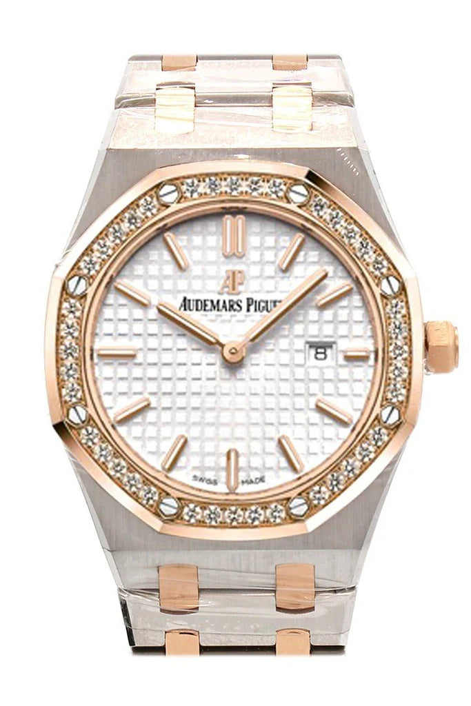 Experience timeless elegance with the Audemars Piguet Royal Oak Lady 33 mm. Featuring a captivating silver-toned dial nestled within a refined blend of 18K pink gold and stainless steel, this watch combines luxury with durability. Perfectly suited for the modern woman who values both style and reliability, it exudes sophistication with every detail. Elevate your wristwear collection with this exquisite Swiss timepiece.