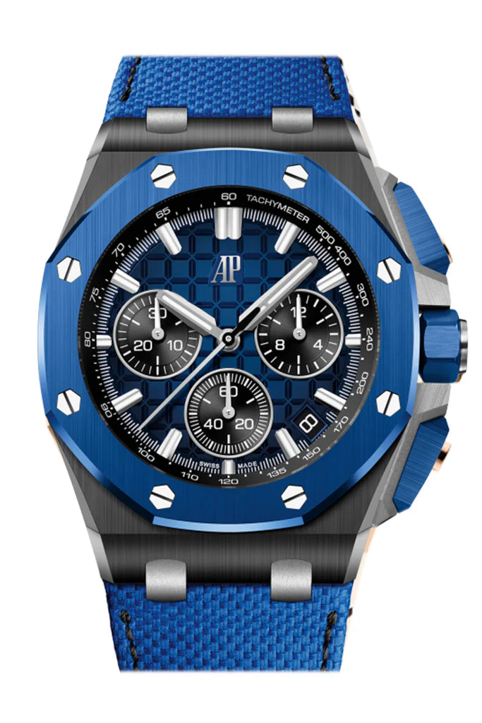 Elevate your wrist game with the Audemars Piguet Royal Oak Offshore 43 Chronograph Ceramic Blue Dial Watch (26420CE.OO.A043VE.01). This timepiece exudes contemporary elegance and robustness, perfect for the modern gentleman.