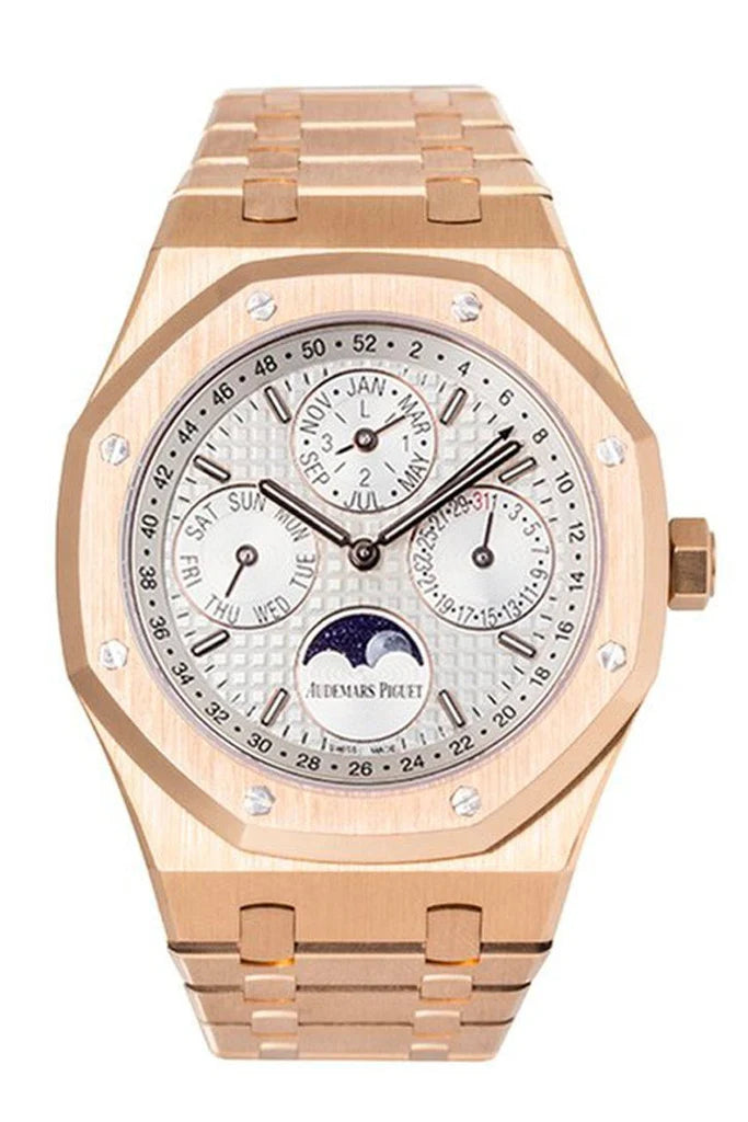 Indulge in luxury with the Audemars Piguet Royal Oak Perpetual Calendar. This exquisite timepiece, crafted in 18 carat pink gold, features a classic silver dial and offers a perpetual calendar function, showcasing day, date, month, moon phase, and leap year indicators. Perfect for the sophisticated gentleman who values both elegance and complication, it embodies Swiss watchmaking excellence and precision. Elevate your collection with this prestigious watch that combines timeless design with practical functionality.