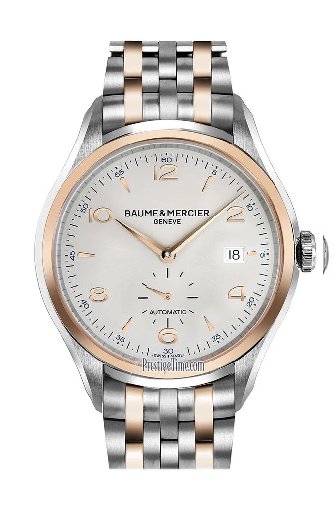 Introducing the Baume & Mercier Clifton Automatic Silver Rose Gold Watch 10140 - a distinguished timepiece that embodies luxury and sophistication. Featuring a sleek silver dial with elegant rose gold-plated hands and hour markers, this watch exudes refined style. The stainless steel case with rose gold accents and a brown alligator strap adds a touch of opulence and durability. Powered by a Swiss automatic movement, the Clifton 10140 ensures precise and reliable timekeeping. Elevate your collection with this iconic timepiece, now available for those who appreciate the perfect blend of tradition and modernity.