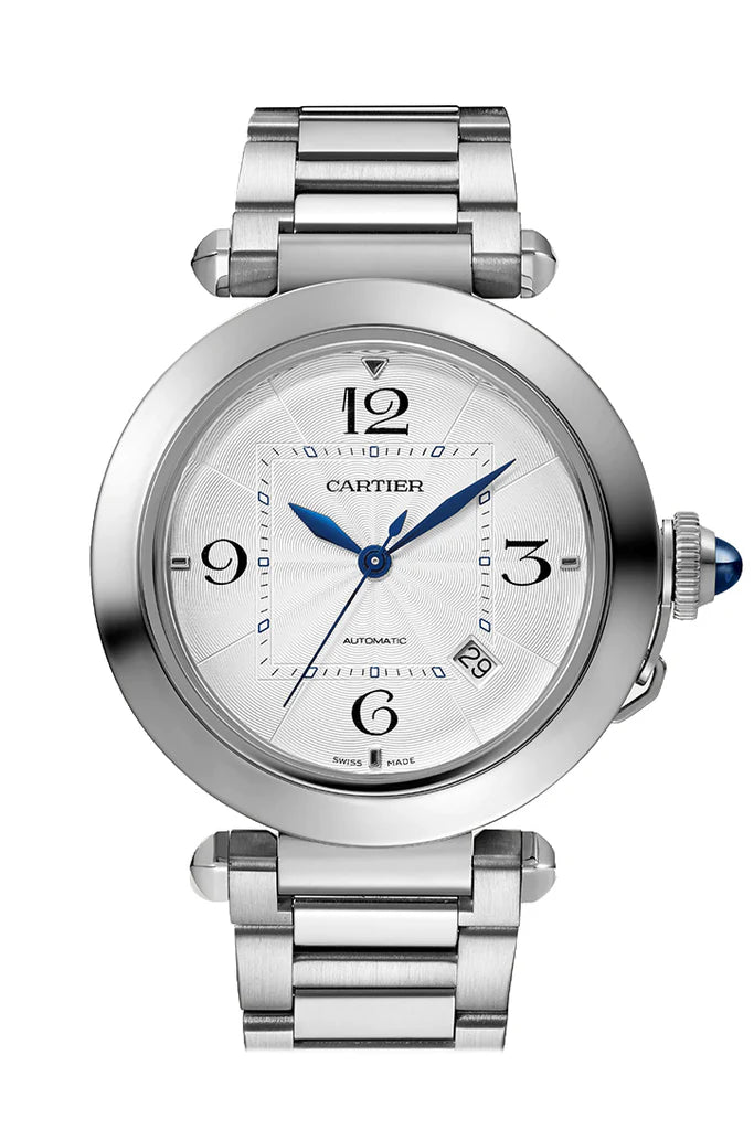 Introducing the Cartier Steel Pasha Men's Silver Dial WSPA0009 - an epitome of timeless elegance and sophistication. This distinguished timepiece features a classic silver dial adorned with black Arabic numerals and blue sword-shaped hands, embodying Cartier's iconic aesthetic. The stainless steel case exudes durability and refinement, while the integrated bracelet offers both comfort and style. With its versatile design, this watch effortlessly complements any attire, making it a perfect accessory for every occasion. Elevate your wrist with the timeless elegance of the Cartier Steel Pasha Men's Silver Dial WSPA0009.