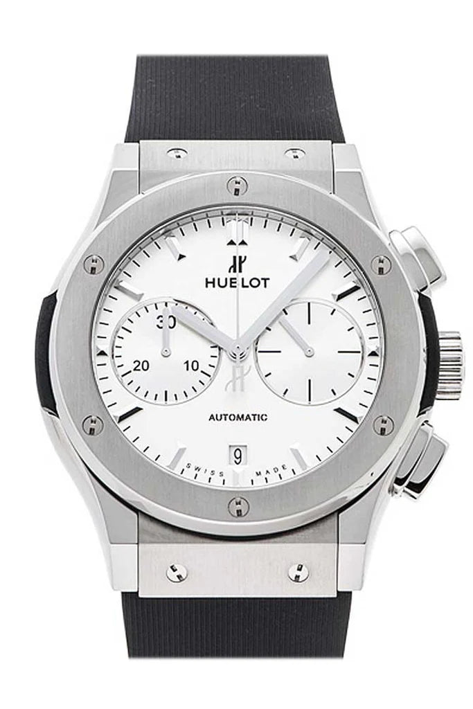 Introducing the Hublot Classic Fusion Chronograph White Dial 45mm Automatic in Titanium on Black Rubber Strap (521.NX.2611.RX): A Fusion of Elegance and Performance. Meticulously crafted, this exemplary timepiece seamlessly blends classic design with modern functionality. Its titanium case exudes understated luxury, while the crisp white dial adds a touch of refinement. With a precise automatic movement and a durable black rubber strap, this watch offers impeccable timekeeping and comfort. Whether it's a formal occasion or everyday wear, elevate your style effortlessly with the Hublot Classic Fusion Chronograph on Black Rubber Strap, a true symbol of versatility and sophistication.