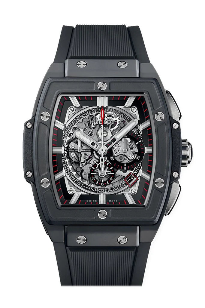 Introducing the Hublot Spirit of Big Bang Chronograph 42mm Men's Watch (641.CI.0173.RX): A Fusion of Bold Design and High Performance. Meticulously crafted, this exceptional timepiece seamlessly blends avant-garde aesthetics with cutting-edge technology. Its ceramic case boasts a distinctive tonneau shape, exuding contemporary elegance and versatility. The skeletonized dial showcases the intricate chronograph movement, offering a mesmerizing view of its inner workings. With a bold design and impeccable craftsmanship, this watch is a true statement piece for the modern man. Elevate your style with the Hublot Spirit of Big Bang Chronograph 42mm Men's Watch, a symbol of innovation and sophistication.