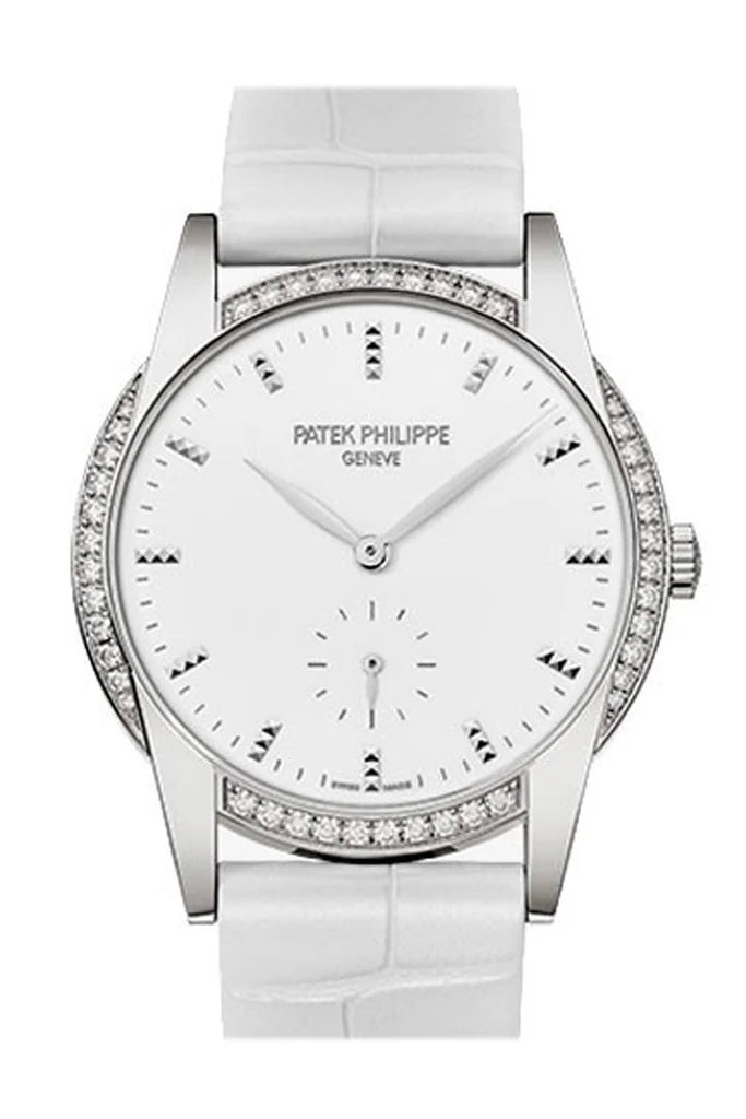 Introducing the Patek Philippe Calatrava Gold Ladies Watch 7122/200G-001, a masterpiece of elegance and refinement. Crafted from luxurious 18k gold, this timepiece exudes sophistication and timeless beauty. The round case is adorned with dazzling diamonds, adding a touch of glamour to the design. The pristine white dial features classic Roman numerals and delicate hands, creating a harmonious aesthetic. Powered by a precise quartz movement, this watch offers impeccable accuracy and reliability. With its exquisite craftsmanship and understated elegance, the Patek Philippe Calatrava Gold Ladies Watch 7122/200G-001 is sure to captivate the hearts of discerning collectors.