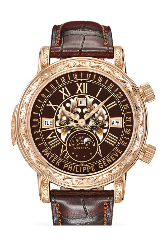 Elevate your wristwear to the pinnacle of luxury with the Patek Philippe Grand Complications Brown Dial Watch (6002R-001). Meticulously crafted with precision and sophistication, this timepiece features a rich brown dial housed within an exquisite 18k rose gold case. With its intricate complications and timeless design, this watch is a true testament to horological mastery. Make a statement of refined elegance with Patek Philippe.