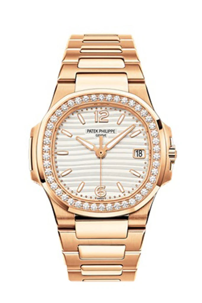 Introducing the Patek Philippe Nautilus 18kt Rose Gold White Dial 32mm Diamond Ladies Watch 7010/1R-011, a captivating blend of luxury and elegance. Crafted with meticulous attention to detail, this exquisite timepiece features an 18kt rose gold case and bracelet, radiating sophistication and grace. The white dial, adorned with diamonds, adds a touch of opulence, while the iconic Nautilus design enhances its timeless appeal. Powered by a quartz movement, this watch offers precise and reliable timekeeping. Perfect for the modern woman who appreciates fine craftsmanship and luxurious style, the Patek Philippe Nautilus 7010/1R-011 is a true masterpiece of horological artistry.